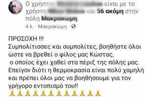 Χθες, Δευτέρα 14 Μαρτίου, η τοπική κοινότητα Μακρακώμης, με ανάρτηση της στα μέσα κοινωνικής δικτύωσης, ζήτησε τη συνδρομή και των κατοίκων προκειμένου να εντοπιστεί ο 27χρονος.