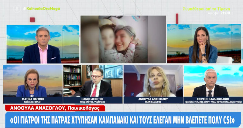 Μιλώντας στην εκπομπή «Κοινωνία Ώρα», η ποινικολόγος Ανθούλα Ανάσογλου τόνισε ότι οι γιατροί και ορισμένοι δημοσιογράφοι της Πάτρας έκαναν πρώτοι γνωστή την υπόθεση, όταν άλλοι υποστήριζαν «να σταματήσουμε να βλέπουμε αστυνομικές ταινίες».