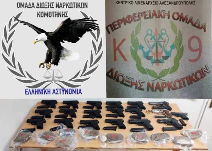 Ειδικότερα, μετά από κατάλληλη αξιοποίηση στοιχείων οι αστυνομικοίπραγματοποίησαν συντονισμένη επιχείρησησε συνεργασία με την ΠεριφερειακήΟμάδα Δίωξης Ναρκωτικών του Κεντρικού Λιμεναρχείου Αλεξανδρούπολης, κατά τη διάρκεια της οποίας εντόπισαν και συνέλαβαν τον δράστη, διότι εισήλθε παράνομα στη Χώρα μας από την Τουρκία, μεταφέροντας όπλα και ναρκωτικές ουσίες.