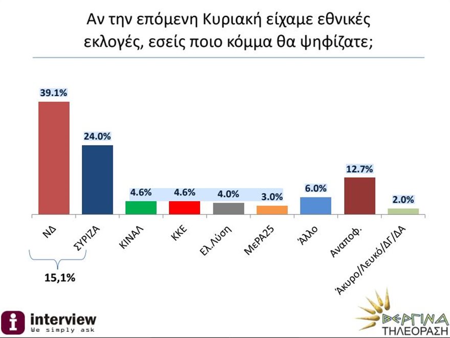 Πανελλαδική δημοσκόπηση της εταιρείας Interview η οποία διενεργήθηκε για λογαριασμό του ΒΕΡΓΙΝΑ TV δίνει προβάδισμα 15,1 μονάδες στη ΝΔ έναντι του ΣΥΡΙΖΑ με ποσοστά της πρόθεσης ψήφου 39.1% έναντι 24.0%.