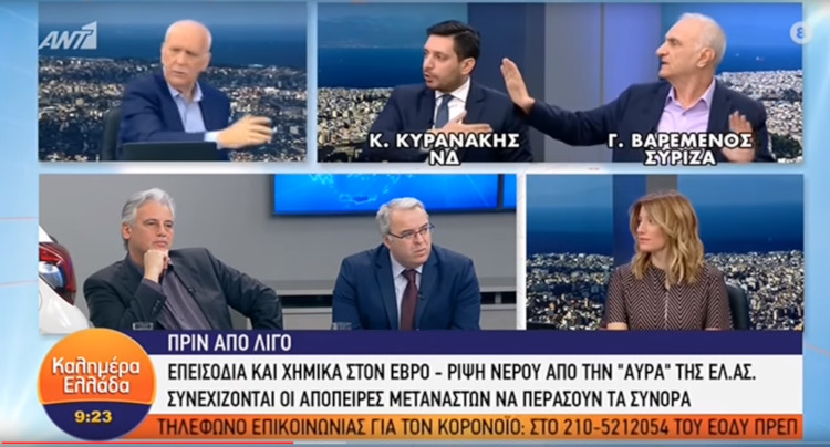 Κατά την παρουσία και των δύο στην εκπομπή του Γιώργου Παπαδάκη του ANT1 και με αφορμή τις χθεσινές δηλώσεις του κ. Βαρεμένου για τους κατοίκους του Έβρου ότι «βγήκαν με τις καραμπίνες να προστατέψουν τις βίλες τους» καθώς και η επίσης βαριά φράση του ιδίου ότι «Με την τακτική αυτή (ενν.: η Κυβέρνηση) οδηγούν τη χώρα σε εθνική ήττα» προκάλεσε την έκρηξη του βουλευτή της ΝΔ.