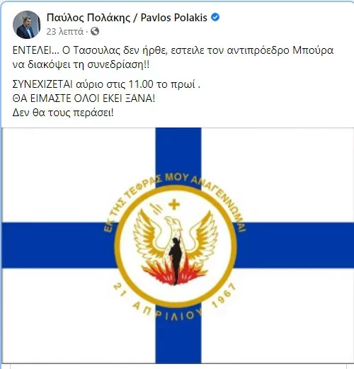 «Εντέλει… ο Τασούλας δεν ήρθε, έστειλε τον αντιπρόεδρο Μπούρα να διακόψει τη συνεδρίαση!! Συνεχίζεται αύριο στις 11:00 το πρωί. Θα είμαστε όλοι εκεί ξανά! Δεν θα τους περάσει».