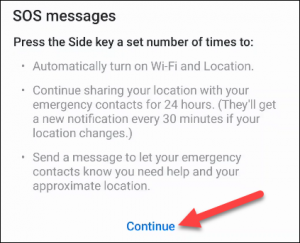 Θα εμφανιστεί ένα μήνυμα που θα σας εξηγεί τι ακριβώς κάνουν τα μηνύματα SOS. Πατήστε “Συνέχεια” για να προχωρήσετε.