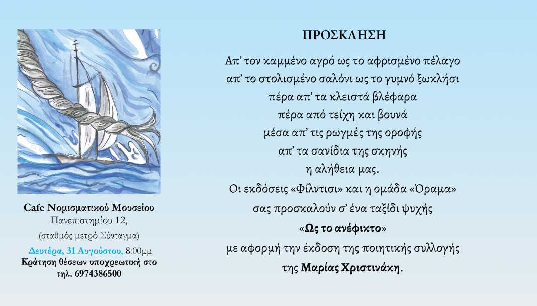 Με αφορμή την έκδοση της πρώτης ποιητικής συλλογής της Μαρίας Χριστινάκη από τις εκδόσεις «Φίλντισι», τα μέλη της ομάδας «Όραμα» κάνουμε μια απόπειρα ν’ απεκδυθούμε ρόλους και μάσκες της καθημερινότητας να μιλήσουμε από καρδιάς να μετουσιώσουμε τον λόγο του ενός σε πράξη των πολλών.